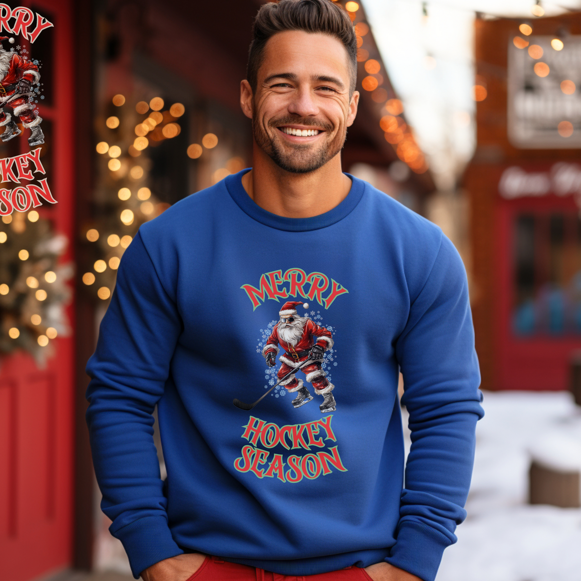 Introducing our festive and sporty "Santa Slapshot" Christmas sweater – where Santa takes to the ice with hockey stick in hand! Celebrate the holiday season in style as St. Nick showcases his skills on the hockey rink, adding a playful and energetic touch to your winter wardrobe. This cozy sweater is crafted for both comfort and Christmas cheer, featuring a vibrant design that effortlessly blends the magic of the season with the thrill of the game. Whether you're heading to a holiday party, cheering on your favorite team, or simply spreading the joy of the season, our "Santa Slapshot" sweater is the perfect choice. Embrace the spirit of winter festivities with this unique and whimsical Christmas sweater – because Santa's not just delivering gifts; he's scoring goals too! The perfect Christmas sweater for the Hockey lover in your life.